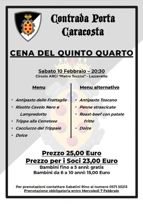 La Contrada Porta Caracosta di Cerreto Guidi (Firenze) sabato 10 febbraio alle ore 20:30, presso il Circolo Arci Pietro Tozzini di Lazzeretto, organizza la “Cena del quinto quarto”, un evento gastronomico che celebra le frattaglie ed i piatti della tradizione popolare. Il menù propone un antipasto di frattaglie seguito da un risotto con cavolo nero e lampredotto, trippa alla cerretese, cacciucco del trippaio e dolce finale. Sarà disponibile anche un menù alternativo. La partecipazione è aperta a tutti con un contributo di 25 euro (ridotto per soci e bambini). È richiesta la prenotazione entro mercoledì 7 febbraio, contattando Rino Sabatini al numero 0571.55213.