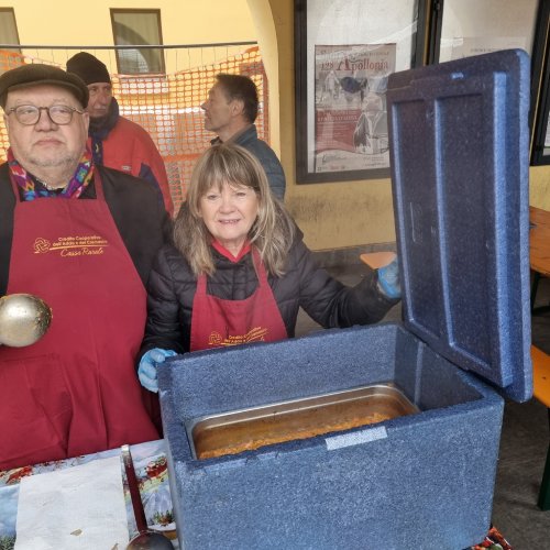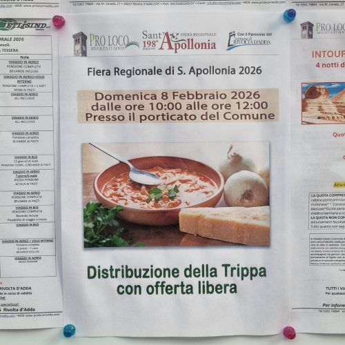 Erano circa una quarantina i chilogrammi di trippa che stamattina a Rivolta d’Adda i volontari della Pro Loco hanno distribuito sotto i loggiati del municipio per celebrare la Fiera regionale di Sant’Apollonia, il mercato bovino più antico della Lombardia vecchio di quasi due secoli. A prepararla con maestria Matteo Fonzo, giovane cuoco che durante la settimana si occupa dei pasti per le scuole e per gli anziani della cittadina cremonese.